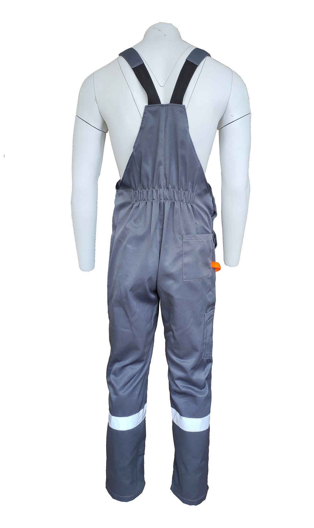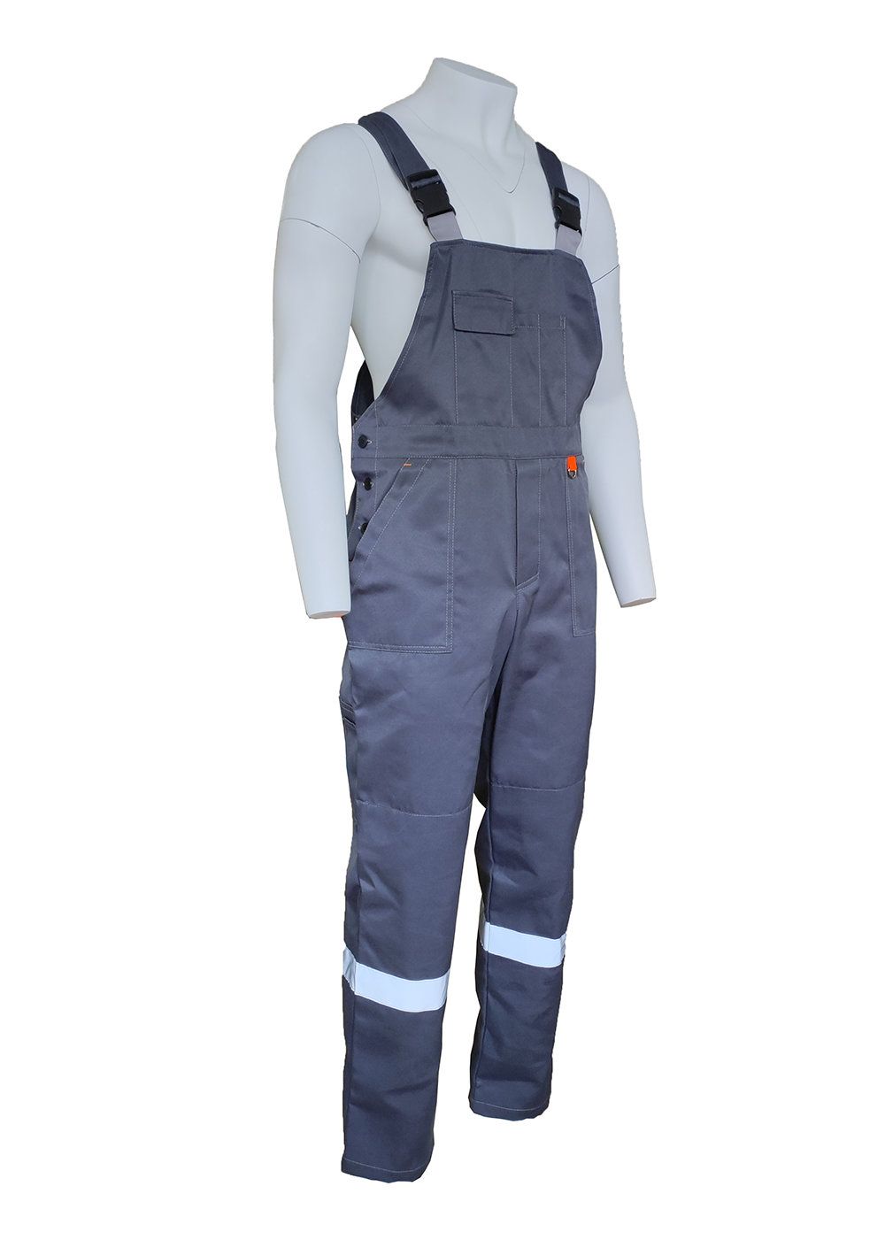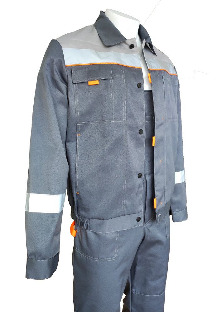 Куртка: четыре кармана для инструментов, отложной воротник, притачной пояс стянут по бокам эластичной тесьмой, по кокетке спинки, полочки и низу брюк - лента СОП 50 мм. Полукомбинезон: передняя застежка на пуговицы, застежка в боковом шве на пуговицы, бретели с фастексами, накладные карманы, по низу световозвращающая полоса СОП 50 мм.