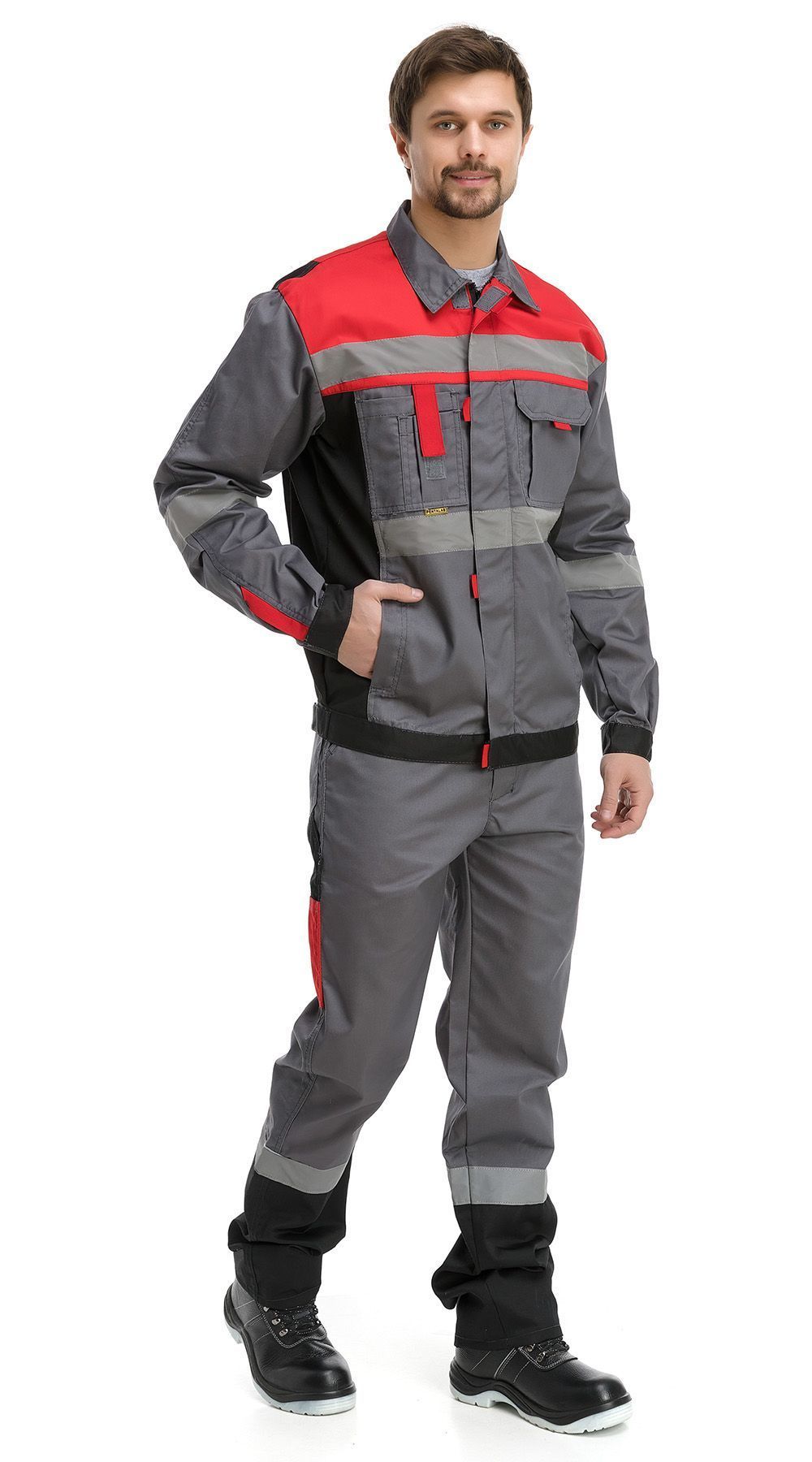 — Первая включает в себя сочетания оттенков красного, чёрного и тёмно-серого, выглядит контрастно, эффектно и достаточно ярко. Больше подходит для опасных видов работ, в которых, благодаря наличию столь ярких цветов в костюме, работника точно будет видно.